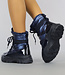 Stichworte: blaue Schneestiefel mit Plateausohle, marineblaue Stiefeletten mit Kunstfell, Kunstfellstiefel, warme Stiefel, Moonboots, Winterstiefel, Details in Lackoptik, Lack, Schnürung