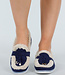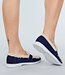 Diese dunkelblauen Slipper sind aus einem Material in Wildlederoptik gefertigt und mit einem weichen Teddyrand in einem kontrastierenden Beigeton verziert. An der Vorderseite ist der Schuh mit einem dekorativen Riemchen und goldfarbenen Details verziert. Die flache Sohle ist leicht und bequem, sodass diese Slipper perfekt für den täglichen Gebrauch in den kälteren Monaten geeignet sind.