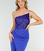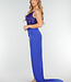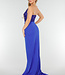 Dieses leuchtend blaue Maxi-Abendkleid hat ein eng anliegendes Mieder, das vollständig mit Pailletten besetzt ist. Das Kleid hat ein asymmetrisches Oberteil mit einem dünnen, transparenten Schulterriemen. Der Rock fällt lang und gerade und hat einen hohen Schlitz an der Vorderseite. Der Stoff ist glatt und fällt sanft in einen langen Saum.