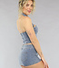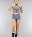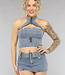 Dieser tolle Zweiteiler ist aus einem Denim-Stoff mit Stretch gefertigt. Das Set besteht aus einem Neckholder-Top und einem Skort. Der Skort fällt kurz und hat einen niedrigen Taillenschnitt. Außerdem hat er zwei Gesäßtaschen und einen breiten Gürtel aus einem passenden Stoff. Der Skort hat außerdem vier Gürtelschlaufen und einen Knopfverschluss. Das Oberteil ist im Halfterschnitt geschnitten und aus dem gleichen Stoff wie der Rock gefertigt. Das Oberteil lässt sich hinten und vorne mit einem Reißverschluss öffnen und schließen. Der vordere Reißverschluss reicht bis zum Hals. Dieses Set ist perfekt für ein Festival!