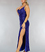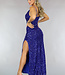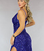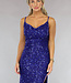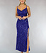 Dieses prächtige Galakleid ist mit Pailletten und Glitter besetzt. Es hat Spaghetti-Träger und der Ausschnitt fällt schön drapiert. Auf der Rückseite befindet sich ein verdeckter Reißverschluss. Das Kleid hat eine gute Passform und fällt unten weit. Das Kleid hat einen schönen Schlitz an der Seite.