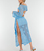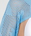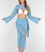 Dieses Strandset besteht aus zwei Teilen aus blauem Häkelstoff: einem taillierten Oberteil und einem Wickelrock. Das Oberteil hat lange, weite Ärmel und ein durchbrochenes Maschenmuster mit dezenten Herzformen. Der Rock ist ebenfalls mit einem Herzmuster gehäkelt, hat einen asymmetrischen Saum und einen hohen Seitenschlitz. Er wird mit einer Schleife in der Taille geschlossen. Der Stoff ist transparent und eignet sich als Strandüberwurf, z. B. über Bademode. Das Material ist leicht und luftig und eignet sich für heiße Sommertage am Strand oder am Pool.