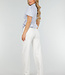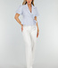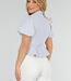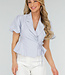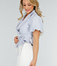 Dieses hellblaue Oberteil ist aus einem glatten Webstoff gefertigt. Es hat kurze, leicht gepuffte Ärmel und einen Wickelschnitt mit tiefem V-Ausschnitt. Das Oberteil hat einen klassischen Reverskragen und wird an der Seite mit einer dünnen Schleife geschlossen, die man durch die Innenseite der Überlappung zieht. Das Unterteil ist leicht ausgestellt und hat eine Schößchenform, die für eine gute Passform sorgt. Die Rückseite ist einfarbig.