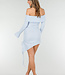 Dieses Kleid ist aus einem hellblauen, leicht gerafften Stretchstoff gefertigt und hat eine figurbetonte Passform. Das Modell ist schulterfrei mit einem geraden Ausschnitt und langen Ärmeln, die bis über das Handgelenk reichen. Der Rock ist kurz und asymmetrisch geschnitten und hat einen verstellbaren Schlitz an der Seite, der mit einem Kordelzug geschlossen wird.