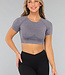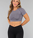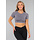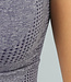 Dieses Sporttop ist aus einem Stretch-Stoff gefertigt. Es hat kurze Ärmel und eine taillierte Form. Das Top hat keine Polster. Es hat einen Rundhalsausschnitt und einen gepunkteten Aufdruck.