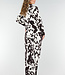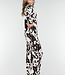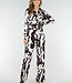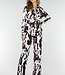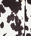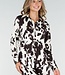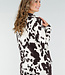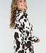Diese Bluse ist aus einem weichen Stoff mit braunem und weißem Kuh-Muster. Sie hat lange Ärmel, einen klassischen Kragen und goldfarbene Knöpfe auf der Vorderseite. Die Bluse fällt gerade am Körper entlang und ist dank der dehnbaren Qualität angenehm zu tragen.