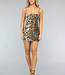 Dieses wunderschöne Kleid ist mit Pailletten besetzt. Diese Pailletten verlaufen über das ganze Kleid. Es hat einen geraden Ausschnitt und elastische Spaghetti-Träger, die nicht verstellbar sind. Außerdem ist das Kleid mit einem Panther-Print versehen. Es hat eine gute Passform, da es Stretch enthält. Außerdem hat dieses Kleid einen weichen Stoff auf der Innenseite, so dass man die Pailletten nicht spürt. Das Kleid fällt bis knapp unter das Gesäß.