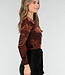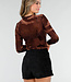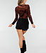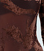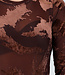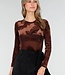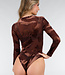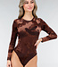 Dieser braune Body ist aus dehnbarem Mesh-Stoff mit einem Flockdruck aus Samt gefertigt. Das Modell hat lange Ärmel, einen Rundhalsausschnitt und eine figurbetonte Passform. Der Stoff ist durchscheinend und schmiegt sich an den Körper an. Die Rückseite hat dieselbe Mesh-Struktur und dieselben Samt-Akzente wie die Vorderseite.