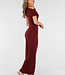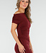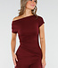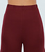 Dieses Set aus bordeauxfarbenem Stretch-Stoff besteht aus einem taillierten Oberteil mit asymmetrischem, schulterfreiem Ausschnitt und kurzen Ärmeln. Das Oberteil ist an der Taille und Hüfte in Falten gelegt. Die passende Hose hat eine hohe Taille und gerade, ausgestellte Beine. Der elastische Bund sorgt für zusätzlichen Komfort. Der Stoff ist dehnbar und fällt sanft am Körper entlang.