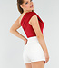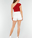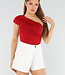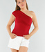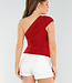 Dieses rote Top hat ein asymmetrisches Design mit einem Schulterriemen auf der linken Seite. Das Oberteil ist eng anliegend und aus einem glatten, leicht glänzenden Stretchmaterial gefertigt. Der Stoff ist an den Seiten und über der Brust leicht plissiert, was eine schmeichelhafte Passform ergibt. Die Rückseite hat die gleiche asymmetrische Form wie die Vorderseite.