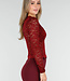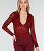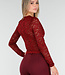 Dieses burgunderrote Crop-Top ist aus transparentem Spitzenstoff mit Blumenmuster gefertigt. Das Modell hat lange Ärmel und einen tiefen V-Ausschnitt mit integrierter Brustnaht für zusätzliche Form. Das Top liegt eng am Körper an und hat eine kurze Passform. Durch die elastische Spitze bietet das Top Stretch für mehr Tragekomfort.