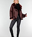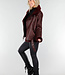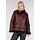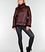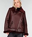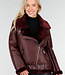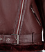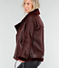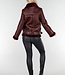 Diese Jacke ist aus burgunderrotem Kunstleder mit einer matten, leicht genarbten Struktur gefertigt. Das Modell hat einen schrägen Reißverschluss vorne und einen Stehkragen, der mit einem weichen Kunstfellfutter verarbeitet ist. Die Jacke hat lange Ärmel, einen Bund mit verstellbarer Schnalle und zwei Seitentaschen mit Reißverschluss vorne. Entlang des Kragens, des Saums und der Ärmel ist die Kunstfellverarbeitung sichtbar verarbeitet. Der Bund verläuft durch Standard-Gürtelschlaufen an der Jacke. Auf der Rückseite befindet sich zusätzlich auf der Innenseite eine zusätzliche Schlaufe mit Knopfverschluss, mit der Sie den Gürtel befestigen können, damit er nicht aus der Jacke rutschen kann.