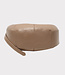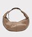 Diese Handtasche ist aus einem glatten, leicht glänzenden Lederimitatstoff mit einer auffälligen, abgerundeten Silhouette gefertigt. Das Design besteht aus mehreren Bahnen, die durch Nähte sichtbar sind, die der Form zusätzliche Kontur verleihen. Der kurze Griff ist robust und mit einem metallischen Einsatz versehen, der einen luxuriösen Akzent setzt.