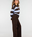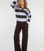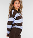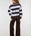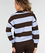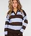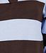 Dieser Polo-Pullover ist aus einem fein gestrickten Stoff mit horizontalen Streifen in Braun und Hellblau gefertigt. Das Modell hat einen V-Ausschnitt mit angesetztem Kragen. Der Pullover hat lange Ärmel, leicht abgesenkte Schulternähte und gerippte Bündchen an der Unterseite und an den Ärmelenden. Die Silhouette ist gerade und reicht bis knapp über die Hüfte.