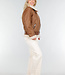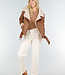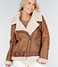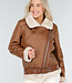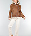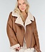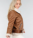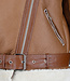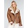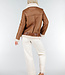 Diese Jacke ist aus braunem Kunstleder mit einer matten, leicht genarbten Struktur gefertigt. Das Modell hat einen schrägen Reißverschluss auf der Vorderseite und einen Stehkragen, der mit einem weichen Kunstfellfutter verarbeitet ist. Die Jacke hat lange Ärmel, einen Bund mit verstellbarer Schnalle und zwei Seitentaschen mit Reißverschluss auf der Vorderseite. Entlang des Kragens, des Saums und der Ärmel ist die Kunstfellverzierung sichtbar verarbeitet. Der Bund wird durch Standard-Gürtelschlaufen an der Jacke geführt. Auf der Rückseite befindet sich zusätzlich eine zusätzliche Schlaufe mit Knopfverschluss auf der Innenseite, mit der Sie den Gürtel befestigen können, damit er nicht aus der Jacke rutschen kann.