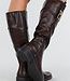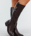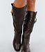 Diese braunen hohen Stiefel sind in einem glatten Lederlook gehalten. Die Stiefel haben einen geraden Schaft, der bis knapp unterhalb des Knies reicht, und sind an der Seite mit einer goldfarbenen Schnalle versehen. Dank des Reißverschlusses an der Innenseite lassen sie sich leicht an- und ausziehen. Die robuste Sohle mit niedrigem Blockabsatz sorgt für eine bequeme Passform. Ein zeitloser Klassiker, der sowohl zu Kleidern als auch zu Hosen kombiniert werden kann.