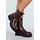 Diese braunen Stiefeletten sind aus glattem Kunstleder gefertigt und haben eine robuste, klobige Sohle mit grobem Profil. Die Stiefeletten reichen bis knapp über den Knöchel und werden an der Innenseite mit einem Reißverschluss geschlossen. An der Außenseite befindet sich ein elastischer Einsatz, der mit einem breiten Band und einer goldfarbenen Schnalle verziert ist. Die Spitze ist abgerundet und der Schaft ist an der Rückseite mit einer Schlaufe versehen.
