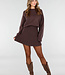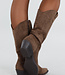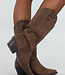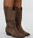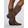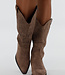 Braune Cowboystiefel aus einem wildlederähnlichen Material mit einer matten, leicht samtigen Struktur. Die Stiefel haben einen festen Schaft bis zur Mitte der Wade mit einem dezent eingeprägten Westernmuster. Das Modell hat eine spitze Zehenkappe und einen niedrigen, geraden Absatz. An der Innenseite befindet sich ein Reißverschluss zum Anziehen. Die Oberseite des Schafts hat eine leicht gewellte V-Form. Die Sohle ist flach mit einem leicht erhöhten Absatz.