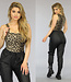 Dieser elastische Body hat einen quadratischen Ausschnitt und breite Schulterträger. Der Boden fällt auf halber Höhe zwischen die Pobacken und unten befindet sich ein Hakenverschluss, der aus zwei Haken besteht, die in drei Positionen eingestellt werden können. Es ist grün und hat einen schwarzen Leopardenaufdruck.
