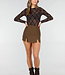 Dieser Body ist aus einem leicht durchscheinenden Mesh-Stoff in Braun mit schwarzem Karomuster gefertigt. Der Body hat eine enganliegende Passform und lange Ärmel. Der Ausschnitt ist rund und der Saum ist hoch geschnitten. Das Muster besteht aus diagonalen schwarzen Linien, die ein kariertes Motiv über die gesamte Oberfläche bilden. Der Body wird mit einem Hakenverschluss geschlossen, der in drei Positionen eingestellt werden kann.