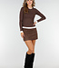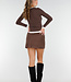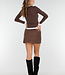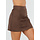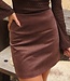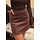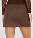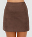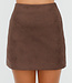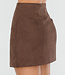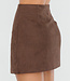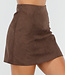 Dieser Rock ist in einem tiefen Braun gehalten und hat eine weiche Wildlederoptik. Er fällt kurz an den Oberschenkeln und hat ein schlichtes, sauberes Design ohne sichtbare Details auf der Vorderseite. Der Stoff hat einen samtigen Griff. An der Seite befindet sich ein blinder Reißverschluss.