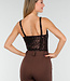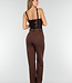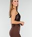 Dieser braune Body hat dank der fein eingewebten Pailletten, die sich über das gesamte Oberteil erstrecken, einen auffälligen, festlichen Look. Der tiefe V-Ausschnitt ist sanft geformt und sorgt für einen eleganten Look. Die Träger sind breit und aus dem gleichen glänzenden, leicht dehnbaren Material gefertigt.