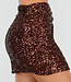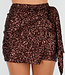 Dieser braune Wickelrock ist reich mit glänzenden Pailletten verziert, die ihm einen warmen, funkelnden Look verleihen. Das kurze Modell wird an der Seite mit einem Kordelzug geschlossen, der den Wickeleffekt schön betont. Die gerade Passform sorgt für einen eleganten, festlichen Look. Ein auffälliges Kleidungsstück, das sich perfekt für besondere Anlässe eignet.