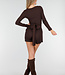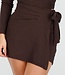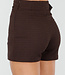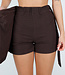 Dieser braune Stretch-Skort hat einen asymmetrischen Überwurf vorne, der mit einer Schleife an der Seite befestigt wird. Die Shorts sind aus einem leicht strukturierten, elastischen Stoff mit feinen vertikalen Linien gefertigt. Die Rückseite hat eine klassische kurze Hose mit enger Passform, während die Vorderseite den Look eines Minirocks hat. Der Bund sitzt hoch. Der Skort wird mit einem verdeckten Reißverschluss an der Seite geschlossen. Der Bund ist mit einem Gummiband versehen, das für zusätzliche Dehnbarkeit sorgt!