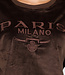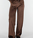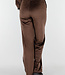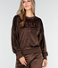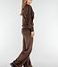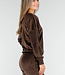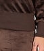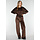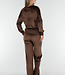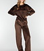 Dieses 2-teilige Set ist aus dunkelbraunem Veloursstoff mit einem sanften Glanz gefertigt. Das Oberteil hat einen Rundhalsausschnitt, lange Ärmel und gerippte Bündchen. Die Hose hat eine locker fallende Silhouette mit geraden, weiten Beinen und einem elastischen Bund mit Kordelzug. Der Stoff fühlt sich weich an und ist dehnbar.