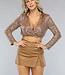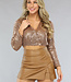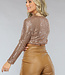 Diese Partybluse ist komplett mit Pailletten besetzt, weshalb sie perfekt für besondere Anlässe ist! Der Ausschnitt der Bluse ist mit einem Kragen versehen, ansonsten fällt sie in einen V-Ausschnitt. Die Bluse hat lange Ärmel und fällt tailliert. Die Bluse hat eine Wickeloptik und wird mit zwei Knöpfen geschlossen, auf der Innenseite befindet sich ein zusätzlicher Knopf, damit die Bluse nicht auffällt. Dieses tolle Oberteil enthält Stretch.
