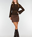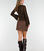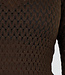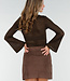 Dieses braune Oberteil ist aus einem leicht offen gestrickten Stretch-Stoff mit sichtbarer eingewebter Textur gefertigt. Der Stoff ist transparent und leicht. Die Ärmel sind lang und am unteren Ende ausgestellt. Das Oberteil ist am Halsausschnitt abgerundet und hat rundherum schmale Paspeln.