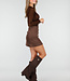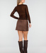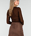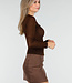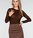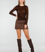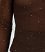 Dieses braune Oberteil ist aus einem halbtransparenten Stretchstoff mit eingewebter Zickzackstruktur gefertigt. Der Stoff ist dezent durchscheinend und mit kleinen Glitzerdetails verziert, die für einen funkelnden Effekt sorgen. Das Oberteil hat einen Rundhalsausschnitt und lange, eng anliegende Ärmel, die sich eng um die Arme schmiegen.