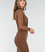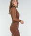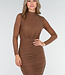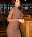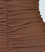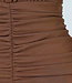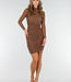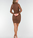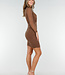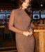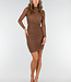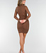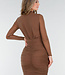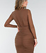 Dieses Kleid ist aus braunem Stretch-Mesh-Stoff gefertigt und hat eine figurbetonte Passform. Das Kleid hat lange Ärmel aus halbtransparentem Material und einen hohen Rundhalsausschnitt. Auf der Vorder- und Rückseite verläuft eine vertikale Plissee-Rüsche, die dem Modell zusätzliche Struktur verleiht. Die Länge reicht bis über das Knie und der Stoff ist dehnbar, sodass Sie sich bequem bewegen können.