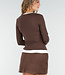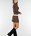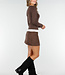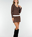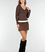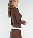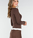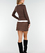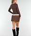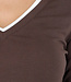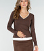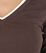 Dieses braune, langärmelige Oberteil ist aus einem glatten, dehnbaren Stoff gefertigt und hat einen V-Ausschnitt. Der weiße Saum entlang des Ausschnitts und der Unterseite bildet ein kontrastreiches Detail.