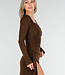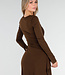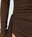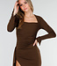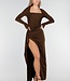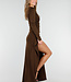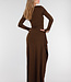 Dieses braune Maxikleid ist aus Stretchstoff gefertigt und hat eine figurbetonte Passform. Das Kleid hat einen quadratischen Ausschnitt, lange Ärmel und einen hohen Schlitz auf einer Seite. Der Stoff ist glatt und fällt eng am Körper entlang. Der Saum hat eine leichte Falte, wodurch er geschmeidig mitbewegt.