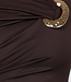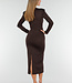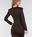 Braunes Midikleid mit figurbetonter Passform und glatter, einfarbiger Textur. Das Kleid hat lange Ärmel und einen einzigartigen drapierten Ausschnitt, der durch einen goldfarbenen Ring zusammengehalten wird. Die Schultern sind leicht strukturiert und mit Schulterpolstern versehen, die für eine elegante Form sorgen. Die Länge reicht bis zur Mitte der Wade und sorgt für einen stilvollen, raffinierten Look.
