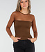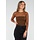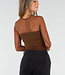 Dieses Oberteil ist aus einem braunen Stretch-Stoff mit einem halbtransparenten Netzoberteil und langen Ärmeln. Das Mieder hat integrierte Polster und ist vollständig gefüttert. Der runde Halsausschnitt und die eng anliegende Passform sorgen für einen eleganten Look. Die Mesh-Ärmel und die Rückenpartie sind transparent, während der Rest des Oberteils eine dichte Oberfläche aufweist. Der Stoff ist glatt und leicht glänzend.