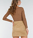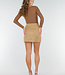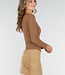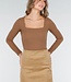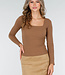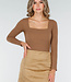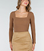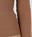 Dieses braune Oberteil ist aus einem dehnbaren Stoff mit klobiger Struktur gefertigt. Das Modell hat einen quadratischen Ausschnitt, der vorne gerade verläuft. Die Ärmel sind lang und das Modell liegt dank des Stretchmaterials eng am Körper an.