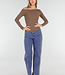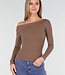 Dieses Oberteil ist aus einem einfarbigen braunen Stretchstoff mit glatter Oberfläche gefertigt. Das Modell hat einen asymmetrischen One-Shoulder-Ausschnitt, bei dem eine Schulter vollständig frei liegt. Das Oberteil hat lange Ärmel und eine taillierte Passform, die über die Hüfte fällt. Der Stoff ist blickdicht und hat eine gleichmäßige Struktur.