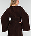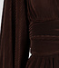 Dieses superelastische braune Plisseekleid hat einen hohen Rundhalsausschnitt und einen locker fallenden Oberteil. Die langen, weit ausgestellten Ärmel bewegen sich dank der feinen Plissee-Struktur locker mit. An der Taille befindet sich ein superelastischer, breiter Rüschenbesatz mit dezenten Wellen für eine betonte Silhouette. Der Rock fällt leicht ausgestellt und hinten wird das Kleid mit einem verdeckten Reißverschluss geschlossen.