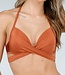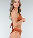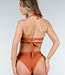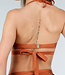 Dieser Bikini ist bronzefarben mit einem Schimmer und aus einem glatten Stoff gefertigt. Das Oberteil ist vorgeformt und hat einen leichten Push-up-Effekt. Das Oberteil hat einen Neckholder-Ausschnitt, den Sie im Nacken binden müssen, und auf der Rückseite befindet sich ein Hakenverschluss. Von der Brust aus verlaufen zwei Bänder unterhalb der Brust bis zum Rücken, wo Sie sie zusammenbinden müssen. Dies ist eine Art Wickeloptik.