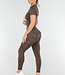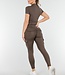 Dieses braune Sportset kombiniert eine kurzärmelige Jacke mit Reißverschluss mit einer hoch taillierten Leggings, die mit mehreren Cargotaschen und einer auffälligen Schleife auf der Rückseite versehen ist. Das Set ist aus einem weichen Stretch-Stoff gefertigt und bietet eine bequeme Passform. Die abgesteppten Linien und Details verleihen ihm einen coolen Look und betonen Ihre Figur!