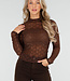 Braunes Spitzenoberteil mit hohem Rundhalsausschnitt und langen Ärmeln. Der durchscheinende Spitzenstoff sorgt für einen eleganten Look. Dank des Stretchanteils schmiegt sich das Oberteil schön an den Körper an.