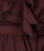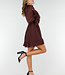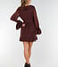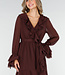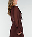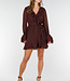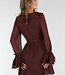 Dieses Kleid ist aus einem braunen Chiffon-Stoff mit dezenter Textur. Die langen Ärmel sind mit einem Gummizug und breiten Volantbündchen mit Spitzenbesatz versehen. Das Kleid wird mit einem Schleifengürtel in der Taille geschlossen und hat ein überspringendes Design mit Rüschen entlang des Ausschnitts und des Saums. Die Innenseite ist gefüttert, die Ärmel sind leicht durchsichtig.