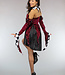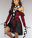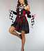 Das Kleid hat Details mit schwarz-weißem Karomuster. Der Rock ist mehrlagig und wirkt zerrissen. Das Kleid hat sehr große asymmetrische Flair-Ärmel. Die Ärmel haben auch auf der Innenseite das Karomuster. Das Oberteil des Kleides ähnelt einem Korsett. Das Kleid ist mit einem Gummizug versehen und lässt sich daher leicht an- und ausziehen. Ein karierter Kragen und eine venezianische Maske vervollständigen den Look.