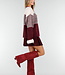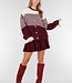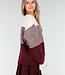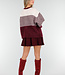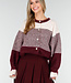 Diese burgunderrote Strickjacke hat einen gestreiften Mittelteil in Beige- und Burgundertönen. Die Strickjacke wird vorne mit runden Knöpfen geschlossen. Die Bündchen an Halsausschnitt, Ärmeln und Saum sind kontrastierend in Beige gehalten. Die Ärmel sind lang und weit geschnitten und haben einen gerippten Abschluss.
