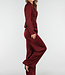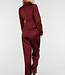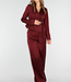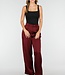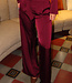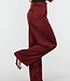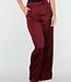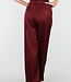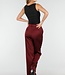 Diese bordeauxrote Hose ist aus einem glatten Stoff in Satinoptik mit dezentem Glanz gefertigt. Das Modell hat eine weite Passform und einen hohen Bund. Die Hose wird vorne mit einem verdeckten Haken- und Reißverschluss geschlossen. Unterhalb des Bundes befinden sich Falten und Gürtelschlaufen.