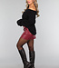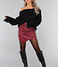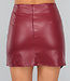 Dieser Rock hat eine hohe Taille und ist aus einem lederähnlichen Stoff mit etwas Stretchanteil gefertigt. Der Rock sitzt gut und hat vorne eine feste Klappe, die ihn asymmetrisch macht. Der Stoff ist vorne in Falten gelegt, was einen schönen Effekt ergibt. Auf der Rückseite befindet sich ein verdeckter Reißverschluss.