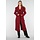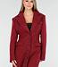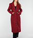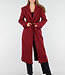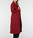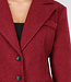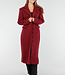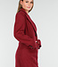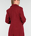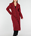 Dieser lange Mantel ist in einem leicht melierten Bordeauxrot gehalten. Der Mantel hat eine gerade und leicht taillierte Silhouette und ist lang geschnitten. Die Vorderseite wird mit einer Reihe schwarzer Knöpfe geschlossen und verfügt über zwei Pattentaschen in Hüfthöhe und eine Brusttasche. Der Mantel hat einen klassischen Reverskragen und dekorative Knopfdetails an den Ärmelenden. Das Material hat eine leicht wollige Optik und eine feste Struktur.
