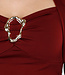 Dieses Oberteil ist aus einem burgunderroten, glatten Stretchstoff mit dichter Struktur gefertigt. Das Modell hat einen Herzausschnitt vorne, der in der Mitte mit einem festen Metallringdetail zusammengehalten wird. Das Oberteil hat lange Ärmel und eine figurbetonte Passform am Oberkörper. Die Konstruktion besteht aus einem Stück, wobei der Ausschnitt und die Ärmel fest miteinander verbunden sind und das Oberteil bis über die Taille reicht.